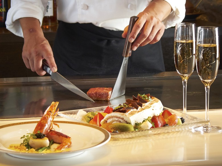 お昼は緑豊かな景色を、夜は夜景を一望できるホテル最上階の鉄板焼きダイニング。ご接待や記念日、ご家族連れ、デートなどに最適です。