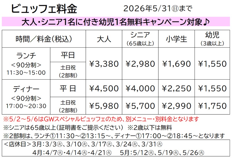 ◆季節のビュッフェ◆ 大人・シニアの方1名につき幼児1名無料!!